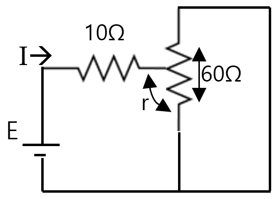 (이렇게 저항을 바꿀 수 있는 것을 가변저항이라고 부르고, 10옴에서 오는 전선의 끝이 60옴 저항의 맨 윗부분부터 아랫 부분까지 어디든 연결될 때 저항의 길이가 차이가 나므로 연결된 위 아래 부분의 저항 값이 각각 변하게 됩니다)