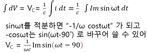 i(t)와 v(t)식을 보면 i(t) = Im sin ωt와 v(t) = (1/ωC) Im sin (ωt-90˚)로