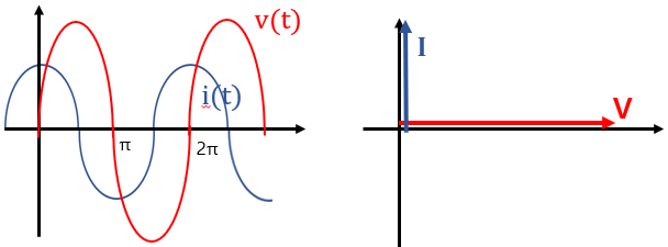 극형식으로 바꾸어보면 i(t) = I∠0˚, v(t) = V∠90˚