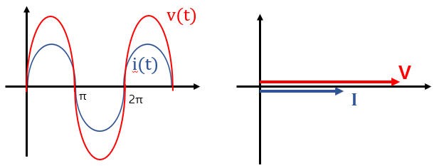 극형식으로 나타내면, i(t) = I∠0˚, v(t) = V∠0˚