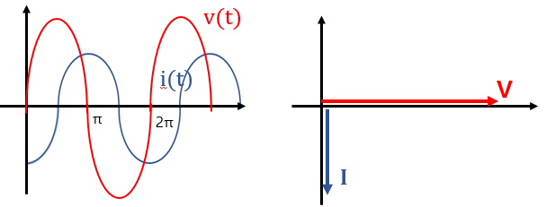 극형식으로 바꾸어보면 i(t) = I∠0˚, v(t) = V∠-90˚